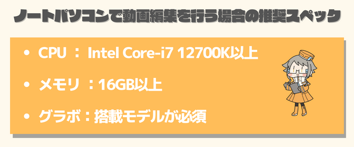 ノートパソコンで動画編集を行うには、下記のようなスペックが必要になります。